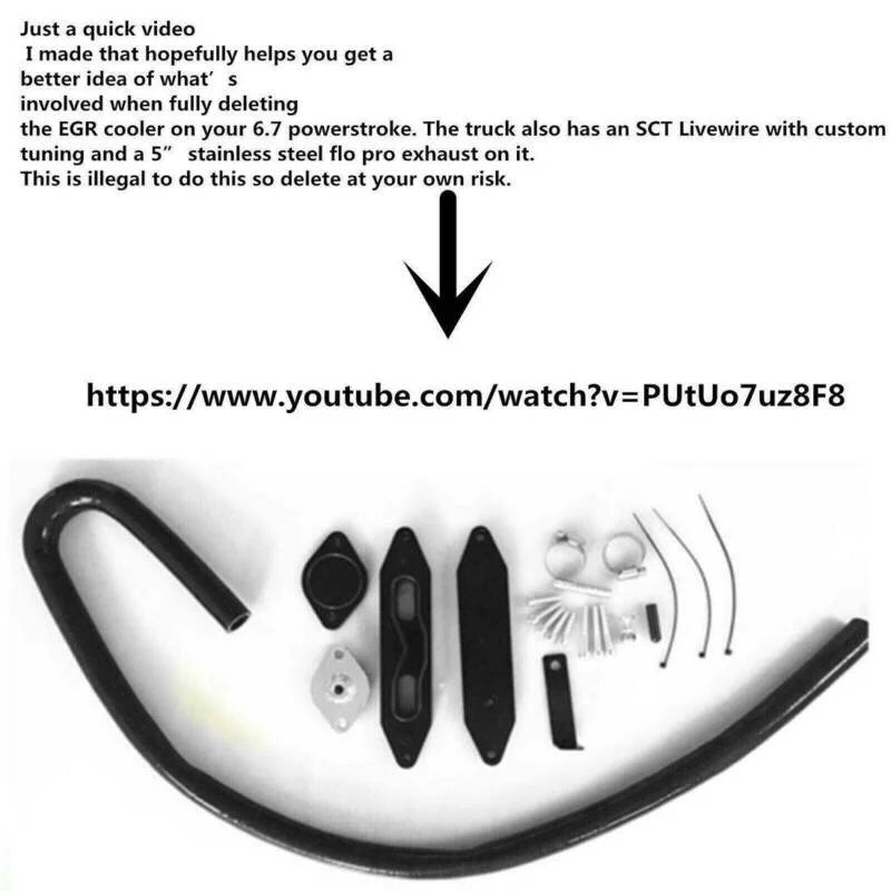 Just a quick video I made that hopefully helps you get a better idea of what’s involved when fully deleting the EGR cooler on your 6.7 powerstroke. The truck also has an SCT Livewire with custom tuning and a 5” stainless steel flo pro exhaust on it. This is illegal to do this so delete at your own risk.